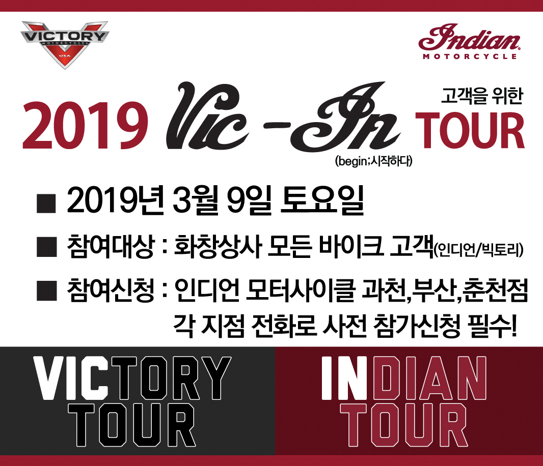 인디언 모터사이클의 공식 수입원인 화창상사가 본격적인 라이딩 시즌을 맞이해 3월 9일, 인디언/빅토리를 포함해 화창상사에서 바이크를 구매한 모든 고객들 대상으로 2019년도 라이딩의 시작을 알리는 ‘빅인투어(VIC-IN TOUR)’를 진행한다.