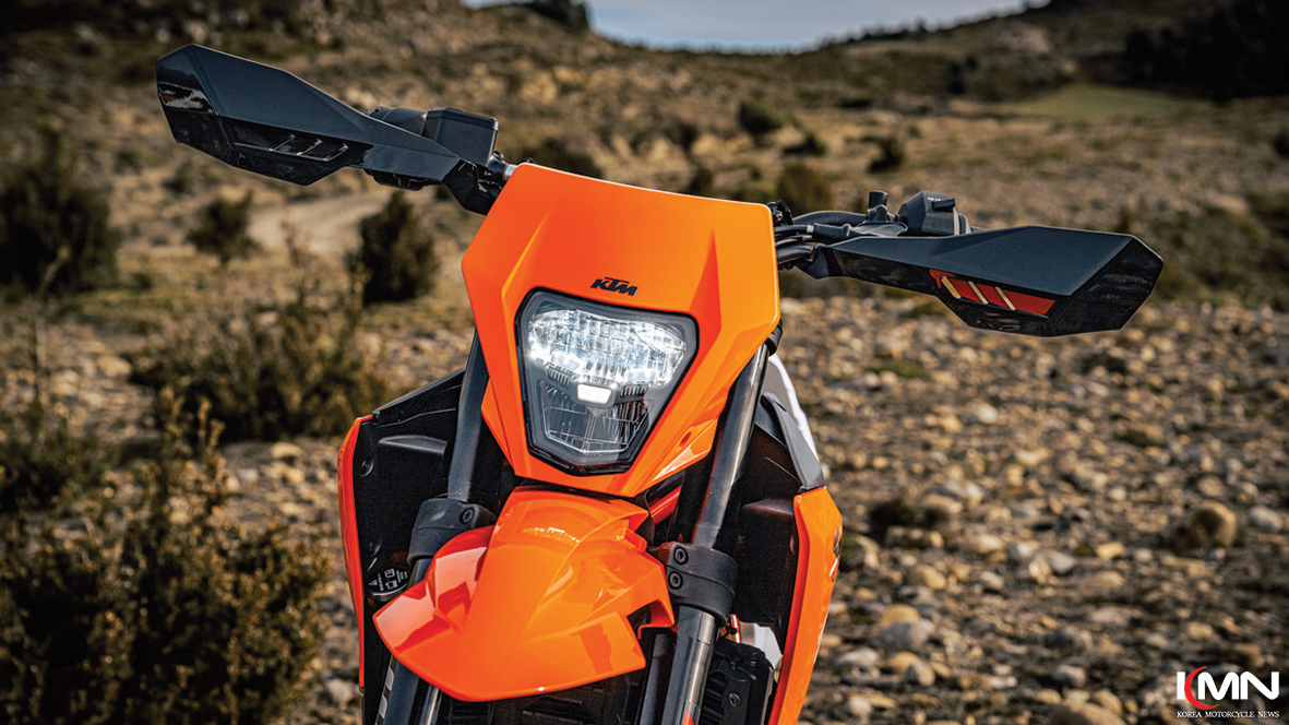 390 엔듀로 R은 21(전)/18(후)인치 휠 조합과 긴 서스펜션 작동폭은 거친 자갈길과 진흙탕조차 두렵지 않다. 스로틀을 당기는 순간 라이더는 자유와 모험의 세계로 빨려 들어간다.