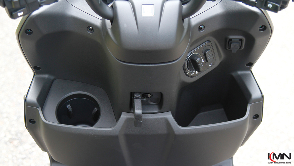 시트 아래에는 21ℓ 용량의 수납공간이 마련됐고, 글러브 박스 또한 널찍하다. 여기에 컵홀더까지 마련해두어서 여름철 온도차 때문에 차가운 음료에서 흘러내리는 물방울들이 다른 소지품을 흥건하게 적시지 않을지 괜한 걱정하지 않아도 된다. 가방이나 장바구니 등 여러 물건을 걸어둘 수 있는 짐고리도 마련됐다. 보부상처럼 짐을 한가득 싣고 다니는 스타일이 아니라면 굳이 탑박스를 설치하지 않아도 될 정도로 수납공간을 잘 만들어 뒀다.