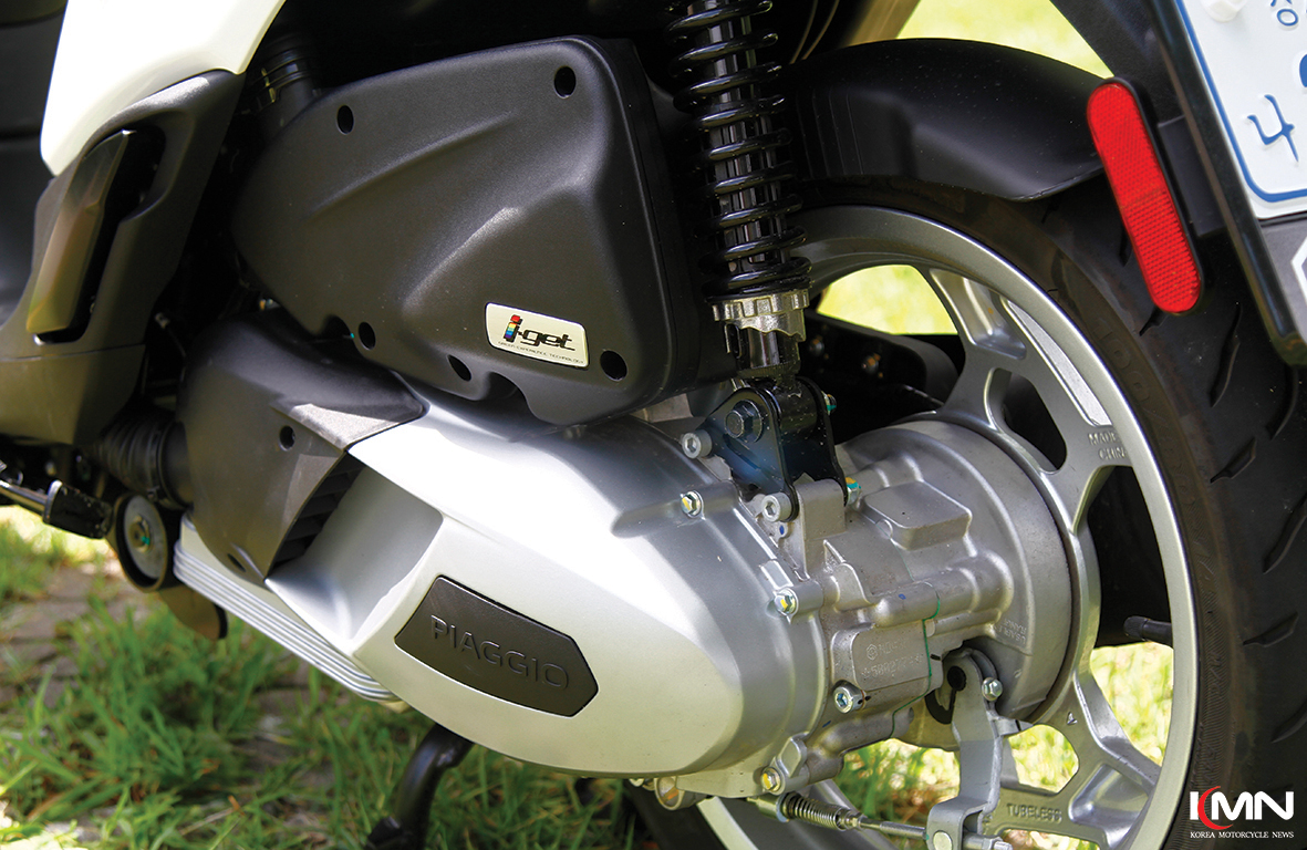 스로틀을 감아 출발하는 순간이 경쾌하고 70km/h 이상까지도 군더더기 없이 쭉쭉 속도를 올라가는 모습에 의외라는 생각이 들었는데, 이 모든 것은 공랭식 엔진임에도 불구하고 최고출력 11.0ps/7,750rpm, 최대토크 1.12kg.m/6,250rpm의 성능을 발휘하는 i-get 엔진 덕분이다. 이는 수랭식 엔진을 장착한 125cc급 스쿠터들과 비교했을 때도 뒤처지지 않을 정도로 높은 성능이다. 날이 갈수록 엄격해지는 환경 규제에 공랭식 엔진으로 이 정도의 출력을 발휘한다는 것은 놀라운 일이다.