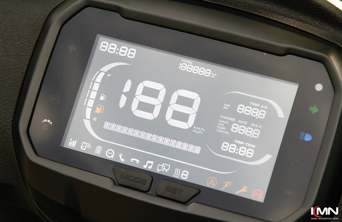 유럽 도심의 고르지 못한 노면에서의 주행성을 보장하는 하이 휠 스쿠터답게 프런트 휠의 크기는 16인치다. 과속 방지턱이 특히나 많은 국내 도로 환경에서 매우 유용하다. 휠베이스는 1,350mm로 도심 주행에 딱 어울리는 콤팩트한 세팅이다. 여기에 프런트 디스크 브레이크와 신뢰도 높은 니신 캘리퍼 그리고 ABS를 더해, 도심에서 발생할 수 있는 다양한 돌발 상황에서도 안심할 수 있는 제동성능을 갖췄다. 모토플렉스 서울에서 시승차를 수령하고 반납하기 위해 복잡한 강남대로와 압구정을 지나면서 몇 번의 위기 상황이 있었지만, 그때마다 믿음직스러운 모습을 보여줬다.
